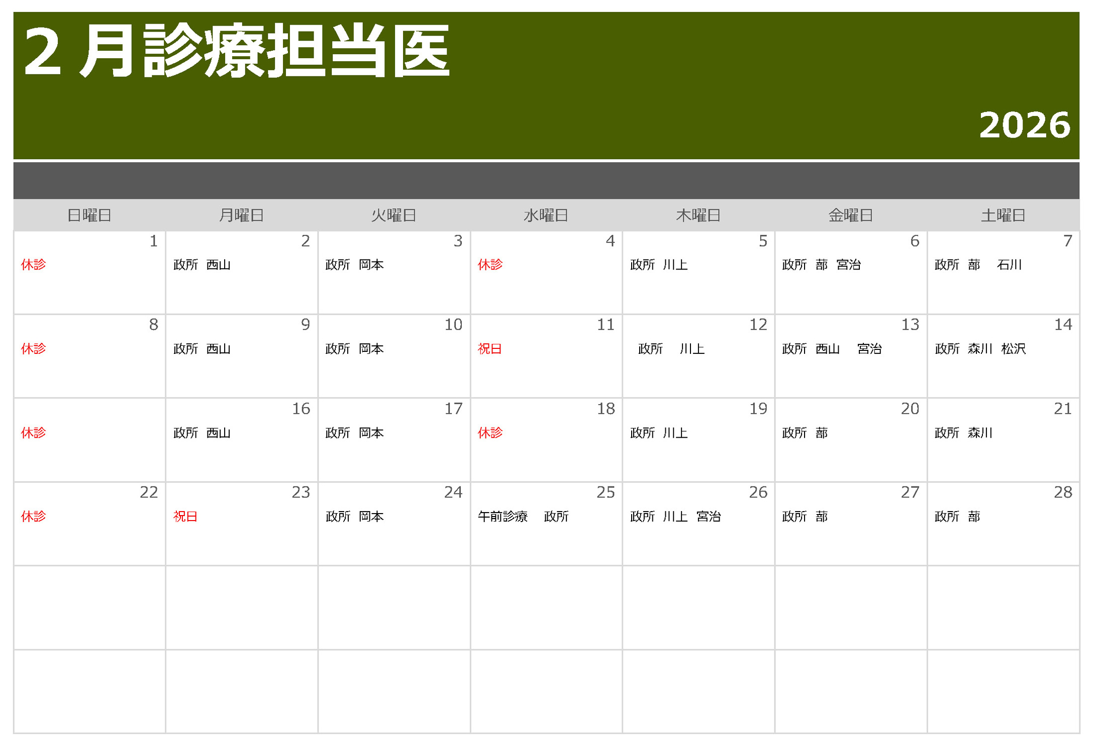 2026年2月の外来診療担当医のお知らせです。